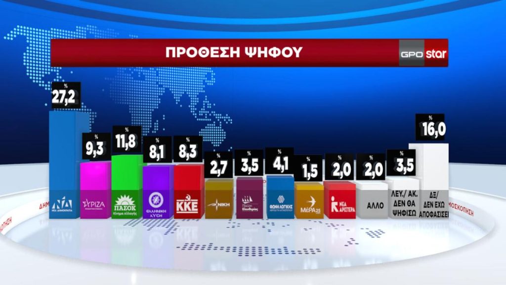 Δημοσκόπηση: Πρώτη η ΝΔ στην πρόθεση ψήφου – Παγιώνεται στη δεύτερη θέση το ΠΑΣΟΚ ενώ υψηλό είναι το ποσοστό των αναποφάσιστων