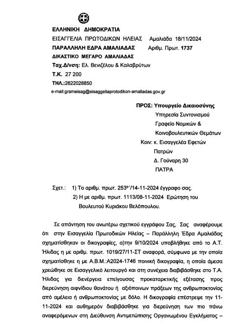 Η ενημέρωση της Εισαγγελίας Πρωτοδικών Ηλείας προς το Υπουργείο Δικαιοσύνης: