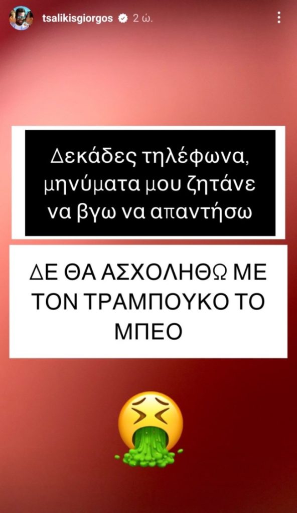Μ’ ένα story στο Instagram αποφάσισε να τοποθετηθεί ο Γιώργος Τσαλίκης σχετικά με όσα είπε ο Δήμαρχος Βόλου, Αχιλλέας Μπέος, κατά τη διάρκεια της παρουσίας του σε τηλεοπτική εκπομπή.